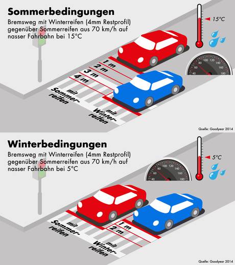 Роберт Беш, тестовый водитель Goodyear, комментирует этот эксперимент: «разница в длине тормозного пути на мокрой дороге очевидна. Но это не единственное отличие летних шин от зимних. В теплое время года зимние шины сдают свои позиции по многим пунктам, будь то боковой увод, сцепление на мокрой дороге или защита от аквапланирования».